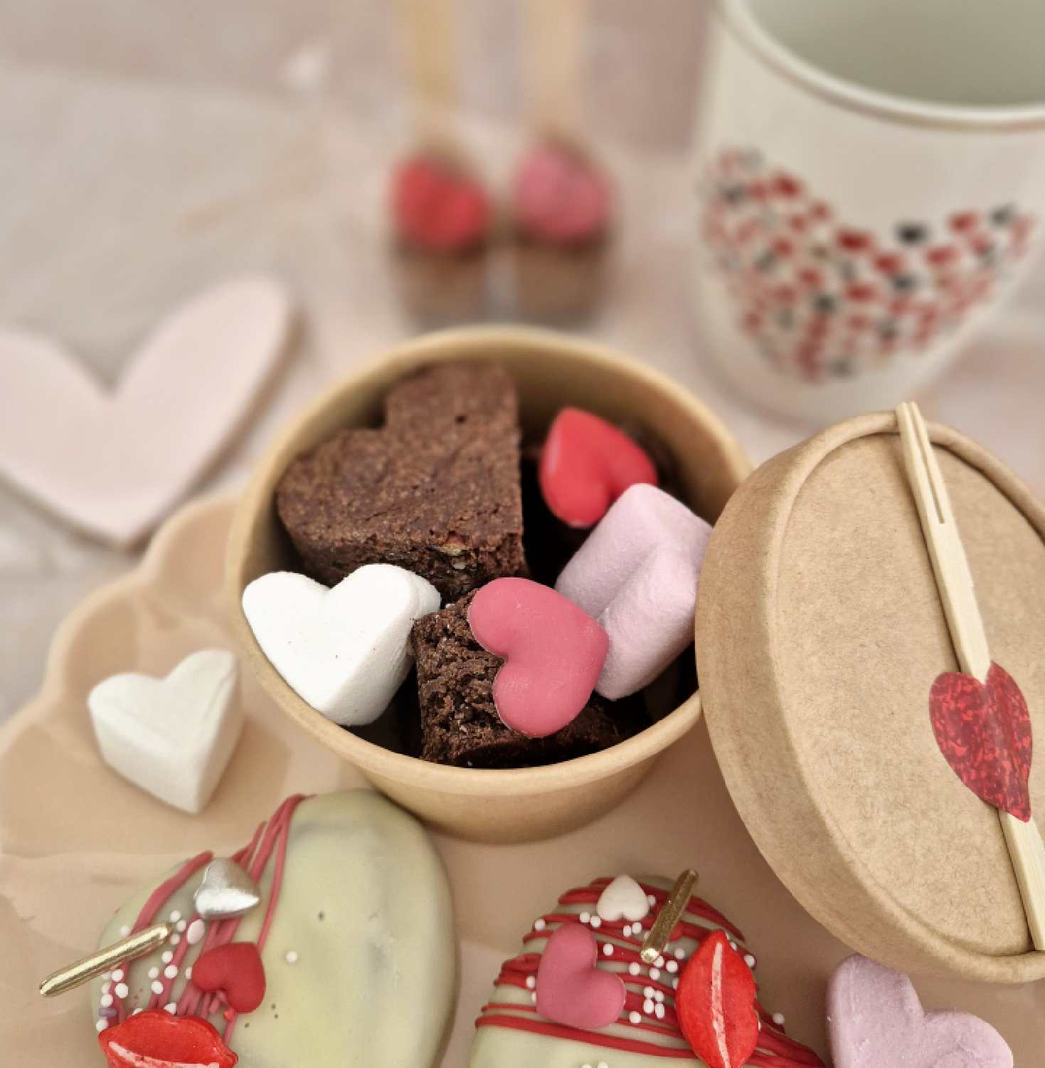La Chill box brownie aux couleurs de la Saint Valentin ! Un petit plaisir (à consommer sans modération) à picorer avec le petit pique fourni sur le dessus de la boîte.